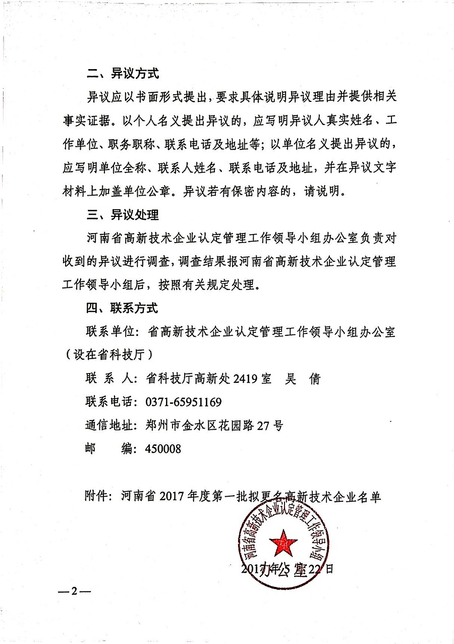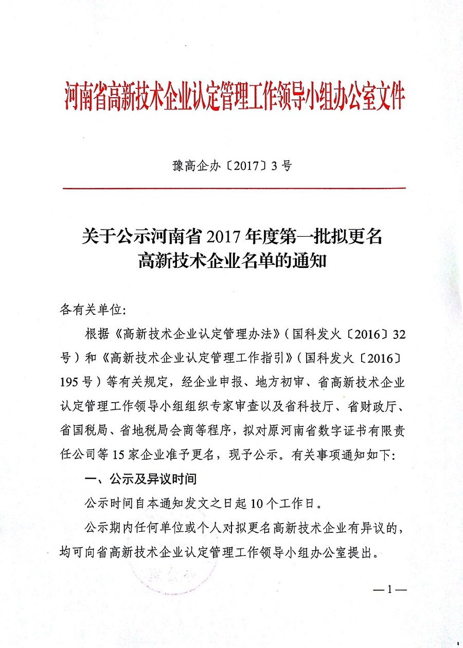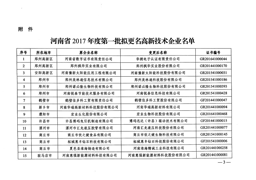 关于公示河南省2017年度第一批拟更名高新技术企业名单的通知